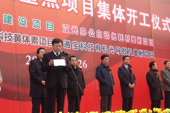 2009年2月26日,邯郸市高新技术开发区东区彩旗飘扬、鼓乐喧天,大红拱门格外耀眼,气球腾空拉起的标语令人夺目,红地毯从路边直通奠基基座。实施科技兴企战略,增强自主创新能力,群英荟萃创大业,励精图治谋发展,做强做大铸辉煌,众志成城写华章……鼓舞人心的话语时时催人奋进。9时18分,随着鞭炮礼炮的阵阵轰鸣声,我厂办公自动化耗材墨粉项目开工奠基仪式正式开始。邯郸市委书记崔江水、市长郭大建等市四套班子领导出席开工仪式进行剪彩,并挥楸铲土为项目奠基。市长郭大建作了热情洋溢的致辞,我厂厂长兼党委书记柴文生作了鼓舞人心的墨粉生产线项目情况介绍。