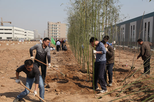 无论是3月12日的春雨还是3月15日的骄阳,都丝毫没有冲淡汉光人植树的热情。无论是部室的员工还是车间的工人,都将对工厂的热爱之情融入了挖坑、栽树的劳动中。三百多米长的植树现场,被划分成17个区域,两条“爱我新汉光,建绿色家园”、“共建绿色和谐家园”大红标语举目可望,鲜艳的中国共产党党旗和汉光重工志愿者服务队旗帜高高屹立在植树现场,十几面彩旗随风飘扬。各单位一到现场就投入到了紧张的劳作中。按照划分的区域,拉开阵势,挥锨挖坑、搬运树苗、放苗扶树、提水浇灌,整个场面热情高涨、干劲十足。他们当中有即将退休的老师傅,也有刚进厂的新员工,不论公司领导还是普通职工都是抢在前、干在先。12日上午,北风夹着小雨,时断时续,时急时疏,不停的打在种树人的脸上身上,没人去避雨,继续挖坑扶苗;15日,温度骤升,直达25度,飞扬的尘土直袭植树人面孔,没有人去乘凉,继续挥臂抡锹。一棵、二棵、三棵,十棵、百棵、千棵。。。。。。经过两天的努力,一共栽下了1400多棵杨树苗和5800多棵毛竹,也种下了全厂职工对新厂区的期望和对公司美好明天的憧憬。