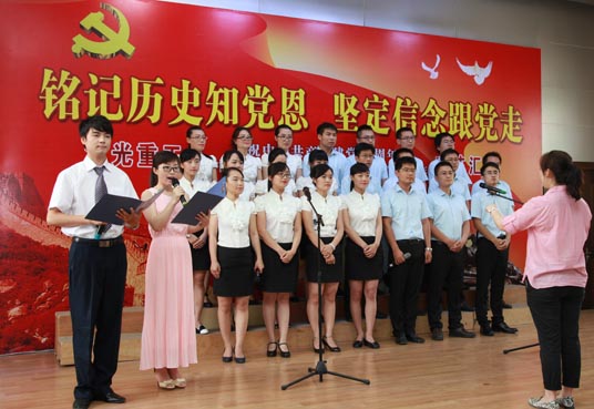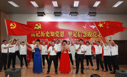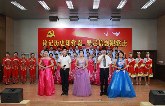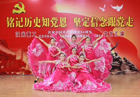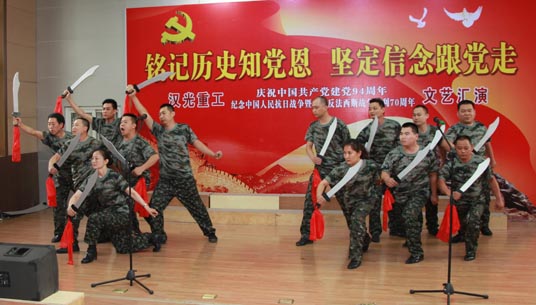六月的天空流光溢彩,六月的大地笑语欢歌。在建党94周年到来之际,26日下午,汉光重工举办了“庆祝中国共产党建党94周年和纪念中国人民抗日战争暨世界反法西斯战争胜利70周年”文艺汇演。公司领导与职工共同观看了演出,演出节目形式多样,有大合唱、小合唱、独唱,还有舞蹈、三句半等,内容精彩纷呈。观众或为出彩的节目热烈鼓掌,或挥舞手中的小红旗和演员一起和拍同唱,会场气氛热情洋溢,高潮迭起。演出在全场同唱《没有共产党就没有新中国》歌曲声中圆满结束。
