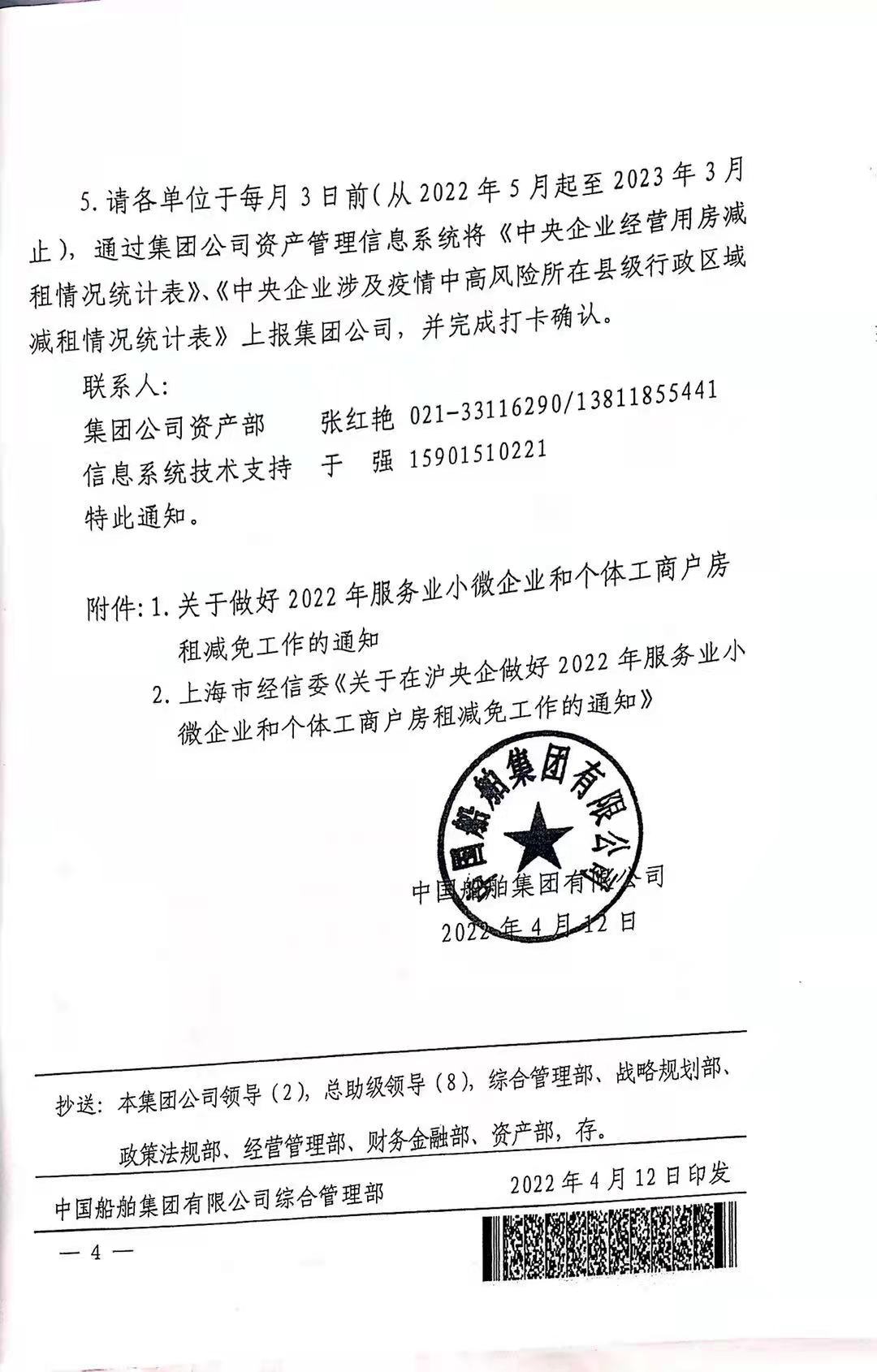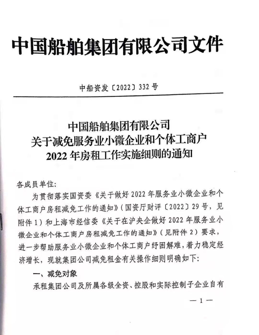 中国船舶集团有限公司关于减免服务业小微企业和个体工商户2022年房租工作实施细则的通知