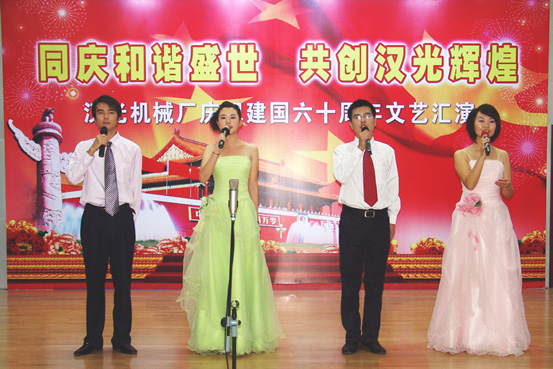 2009年9月25日下午四时,工厂第四会议室灯火辉煌,喜气洋洋,工厂领导、驻厂军代表、各单位中层领导、工会主席与演员欢聚一堂,共庆祖国60华诞。在雄壮的《祝福祖国》音乐背景下,主持人以豪情满怀地赞美祖国的诗句拉开了演出序幕,军品事业部机加车间的大合唱《咱们工人有力量》第一个登台演出,紧接着20个节目相继登场,一个个节目精彩纷呈,一首首歌曲激情奔放。最后全体工厂领导、驻厂军代表上台与全场观众共同合唱《没有共产党就没有新中国》,将整个演出推向高潮。经评委综合评定,评出一、二、三等奖节目。